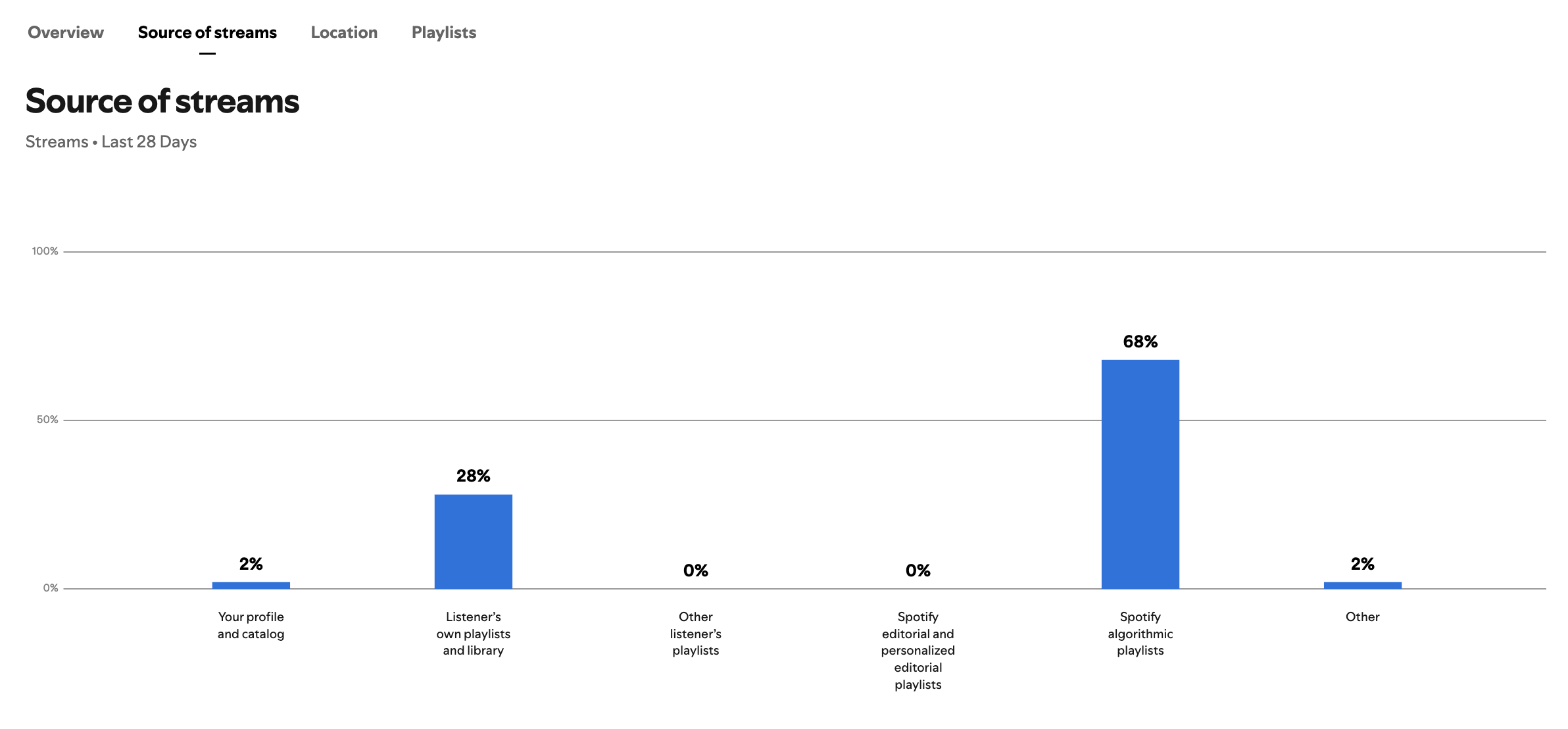Otro indicador clave era el alto porcentaje de reproducciones provenientes de playlists algorítmicas: ¡un 68 %! En otras palabras, la mayoría de los streams son orgánicos, generados porque la gente guarda y escucha activamente su música. Esto provoca que el algoritmo recompense este comportamiento dándole mayor alcance, lo que resulta en reproducciones que son prácticamente gratuitas.