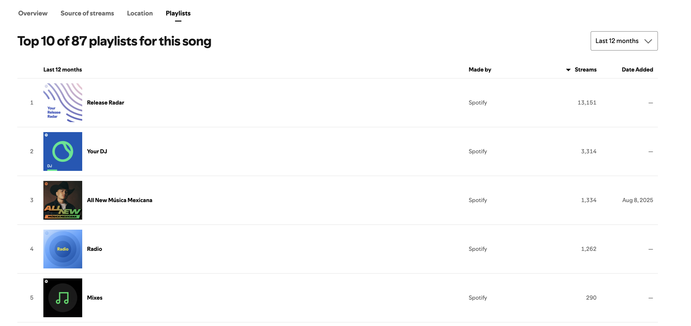 Un ejemplo claro es nuestro caso: aunque estuvimos en una playlist editorial ("All New Música Mexicana"), esta solo nos generó 1,334 streams, mientras que las playlists algorítmicas nos generaron 13,151 streams. ¡Esto es más de 10,000 streams adicionales, lo que representa un 985% más que las editoriales!